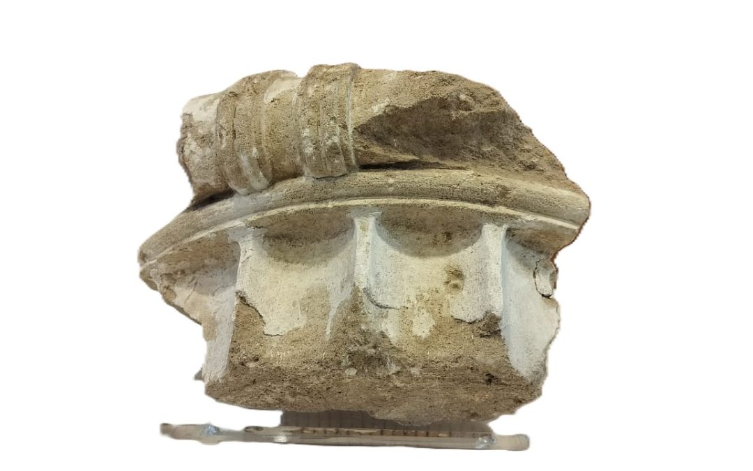 Πρόκειται για θραύσμα ιωνικού κιονοκράνου, κατασκευασμένο από ασβεστόλιθο, το οποίο σώζει κατά τόπους επίχρισμα. Έχει μέγιστες σωζόμενες διαστάσεις: 24 εκ. (ύψος) επί 33,5 εκ. (πλάτος) και εμφανίζει τεχνοτροπικές ομοιότητες με δημοσιευμένα ιωνικά κιονόκρανα από τον χώρο της Αρχαίας Ολυμπίας.